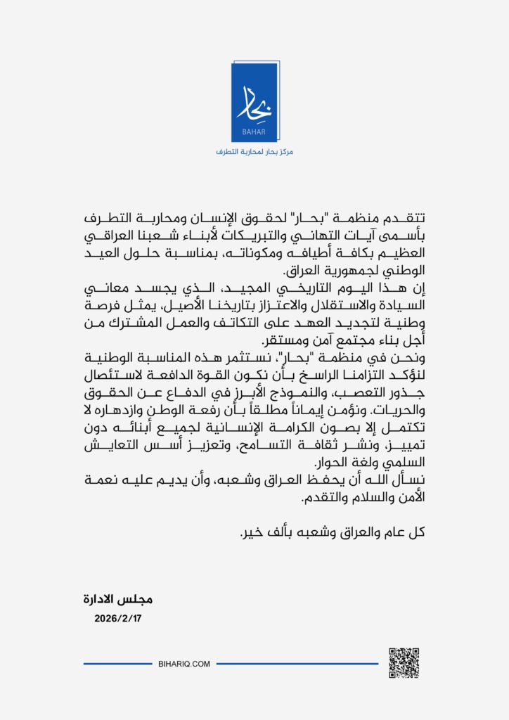 تتقدم منظمة “بحار” لحقوق الإنسان ومحاربة التطرف بأسمى آيات التهاني والتبريكات لأبناء شعبنا العراقي العظيم بكافة أطيافه ومكوناته، بمناسبة حلول العيد الوطني لجمهورية العراق.
